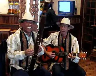 The most emblematic instrument of Madagascar, the valiha, is a bamboo tube zither very similar in form to those used traditionally in Indonesia and the Philippines.[2] The valiha is considered the national instrument of Madagascar.[11][13] It is typically tuned to a diatonic mode to produce complex music based on harmonic, parallel thirds accompanied by a melodic bass line.[1] The strings are traditionally cut and raised from the fibrous surface of the bamboo tube itself,[14] although a contemporary form also exists that instead uses bicycle brake cables for strings to give the instrument a punchier sound.[5]