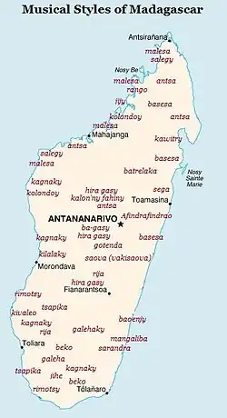 Malagasy music is highly melodic and distinguishes itself from many traditions of mainland Africa by the predominance of chordophone relative to percussion instruments.[4] Musical instruments and vocal styles found in Madagascar represent a blend of widespread commonalities and highly localized traditions. A common vocal style among the Merina and Betsileo of the Highlands, for instance, does not preclude differences in the prevalence of particular instrument types (the valiha among the Merina, and the marovany and kabosy among the Betsileo). Similarly, the practice of tromba (entering a trance state, typically induced by music) is present on both the western and eastern coasts of the island but the vocal styles or instruments used in the ceremony will vary regionally.[5] Music in Madagascar tends toward major keys and diatonic scales,[6] although coastal music makes frequent use of minor keys, most likely due to early Arab influences at coastal ports of call.[7] Malagasy music has served a wide range of social, spiritual and mundane functions across the centuries.