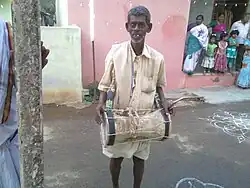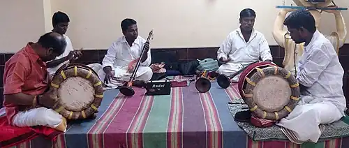 Gaana is a rap-like "collection of rhythms, beats and sensibilities native to the Dalits of Chennai."[2][3] It evolved over the past two centuries, combining influences from the siddhars (tantric adepts) of ancient Tamilakam, Tamil Sufi saints, and more.[2] Gaana songs are performed at weddings, stage shows, political rallies, and funerals. Performers sing about a wide range of topics, but the essence of gaana is said to be "angst and melancholy" based in life's struggles.[2] In the past few decades, the genre has entered the music of the mainstream Tamil film industry and gained popularity.[2][4] Contemporary gaana bands like The Casteless Collective are bringing the genre to new audiences while using it for social activism, especially against caste discrimination.[2]