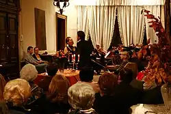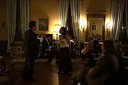 Musica a Palazzo, since 2005, have produced opera performances staged in the Palazzo Barbarigo Minotto, a Venetian Gothic palace facing the Grand Canal. The piano nobile of the palace, with its backdrop of frescoes by Tiepolo and sculptures by Carpoforo Tencalla, is its main performing space.[1] The performing style follows the 19th-century Italian practice of "Salotto Musicale" (Musical Salon). The operas are performed without a stage, with the audience becoming part of the scene.[2][3]