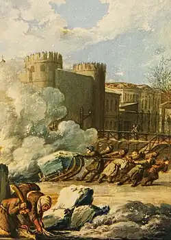 A.I. Musin-Pushkin lived for 17 years in that house, from 1782 till 1798.[22] Nearly all his children were born there, and his main brainchild – the famous collection of Russian antiquities – was created there. Members of "Lovers of Motherland History Study Group" attended meetings there. Formed by Musin-Pushkin, the study group was based upon Vasily Tatishchev's (V. N. Tatischev) theoretical views: I. N. Boltin and Ivan Yelagin (I. P. Yelagin), historian-archivists N. N. Bantysh-Kamensky and A. F. Malinovsky and many others were members of the study group. They gathered to discuss historical and linguistic issues, and the owner willingly allowed them to use his materials. Nikolay Karamzin (N. M. Karamzin) was also associated with the study group. The main purpose of the study group was to preserve a wide range of ancient sources about history and culture of the Russian State and to use that range in social and scientific circulations. Due to Musin-Pushkin, zeal for artefacts of the past got – for the first time in Russia – hitherto unseen scale, organization and insistence to find various sphere of sources, including materials for history of 18th century. Yaroslav the Wise (Yaroslav Mudry's) Russkaya Pravda ("The Russian Truth"), Vladimir II Monomakh's "Moral", Musin-Pushkin's own work about Tmutarakan princedom's location and Laurentian Codex (Lavrenty's annals) were made ready for publishing there. After all, it was exactly there where the pearl of his collection – the famous The Tale of Igor's Campaign – was kept and made ready for publishing. In the first publishing in 1800 "The Song ..." was titled "The ironic song about Novgorod-Seversky appanage prince Igor Svyatoslavovich's campaign against the Polovtsians. The Song was written in old Russian language at the end of 12th century and it was transferred into presently used dialect."[23]