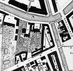 The next owner of the site with all the buildings and the garden was M. A. Kusovnikov, a merchant. In the 1804 city register the plot was placed in the fourth Admiralty division of the first block. The plot was numbered 46 and valued at 50,000 rubles. By the time of the 1822 register, the estate was owned by E. V. Kusovnikova, and was valued at 65,000 rubles.[7] The house appears in Friedrich von Schubert's 1828 plan of the city, its appearance having altered slightly after the construction of an annex near the Moyka and a building along the left border of the plot of land as seen from the Moyka river. This building extended nearly up to the end of the plot and abutted the buildings of the Lithuanian castle. Two buildings parallel to each other stretched along Ofitserskaya ulitza (Officers' Street), where building 31 is now located. By 1828 that part of the estate was owned by the provisioning department of the Ministry of War, which remained its owner until 1842. In 1834 in accordance with E.V. Kusovnikova's will her granddaughter Yelena Petrovna Varentzova became the owner of the estate.[8][9] That year street numeration was introduced, and the plot was designated as number 95 on the Moyka embankment.