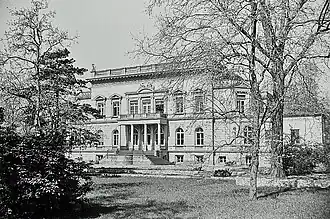 The Musisches Gymnasium Leipzig was housed in the Villa Gebhardt.[1] The building had been constructed in 1880/1881 by the architect Arwed Roßbach for the publishing bookseller Leopold Gebhardt, the owner of J.-M. Gebhardt's Verlag. The Jewish Gebhardt family had lost the property as part of the Aryanisation by the National Socialists. After the Second World War, the building was used for medical purposes and today, with a modern extension, is the Stadtpalais senior citizens' residential home.