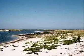 The island was part of Dukes County until 1887 when it was transferred to and annexed by Nantucket County.[2] Shortly after, land on the island was purchased to form the Muskeget Island Club for waterfowl hunting, and several buildings were constructed.[1] Around 1950, half of the island, along with the 8 buildings standing at that time, was purchased by a partnership led by aviator Crocker Snow Sr. (as erosion has changed the shape of that island, that land currently encompasses 2/3 of the island).[1] Snow, who built the Muskeget Island Airport there with his son Crocker Snow Jr., became full owner of the property after the other two partners died.[3] Snow Jr. wrote several books on the island and its ecology[4] and pushed to have it designated as a National Natural Landmark by the National Park Service in April 1980,[5] and having a conservation restriction placed on the island in 2009.[1]