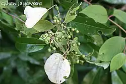 Mussaenda frondosa, commonly known as the wild mussaenda or dhobi tree, is a plant of family Rubiaceae. It is a shrub that grows to about 1.5โ2 m (4 ft 11 in โ 6 ft 7 in) tall. Like most other Mussaenda species, they have a bract beneath their flowers, which in this species is white in colour.[2]