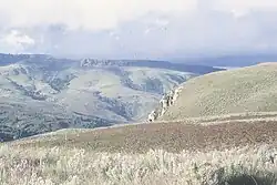 Most of Nyanga National Park is underlain by granite.[12] The highest mountains are composed of Umkondo Group dolerite and sandstone, with the harder dolerite forming cliffs and ridges[13] and the granite-dolerite contact often forming waterfalls.[14] The Troutbeck dolerite sill,[15] shown in the distance in the photograph of Kwaraguza above, was dated at 1099 Ma.[16]