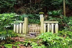 The Niō gate behind them leads to the 50-step mossy stairway which today is the temple's main claim to fame, and which has gained it the above-mentioned nickname "Kokedera". At the bottom of the stairs are two caves, of which one hosts a statue of Nichiren, while the other is a mausoleum to many of the priests that have lived here.[4] Above the mossy stairs there is a third building called Hokkedō, or Hall of Scriptures.[4]