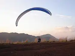 The paragliding at Myōjinyama requires neither registration nor inscription fee. The launch is shallow, thus suitable for novice pilots. The 1 km2 (0.39 sq mi) area can be used for both launches and landings. There is also an additional free landing zone courtesy of the Minami Green Hill Resort in the vicinity of Lake Yamanaka. Other landing areas include most of the coast of Lake Yamanaka and the multiple tennis courts and football fields that can serve for an emergency landing.
