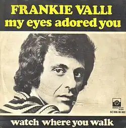 "My Eyes Adored You" is a 1974 song written by Bob Crewe and Kenny Nolan.[3] It was originally recorded by The Four Seasons in early 1974. After the Motown label balked at the idea of releasing it, the recording was sold to lead singer Frankie Valli for $4000. After rejections by Capitol and Atlantic Records, Valli succeeded in getting the recording released on Private Stock Records, but the owner/founder of the label, Larry Uttal, wanted only Valli's name on the label. The record features the full group, marking the debut of Gerry Polci on tenor (harmony) vocals, with Joe Long taking lead on the final chorus.[4] It is from the album Closeup. The Seasons debuted the song in late September 1974 at the Tulsa State Fair for an episode of The Midnight Special[4] ahead of its release as a single in the US in November 1974; it topped the Billboard Hot 100 in March 1975.[3] "My Eyes Adored You" also went to number 2 on the Easy Listening chart.[5] Billboard ranked it as the No. 5 song for 1975.
