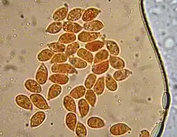 The spores are broadly ellipsoid, amyloid (meaning they will adsorb iodine when stained with Melzer's reagent), and measure 7–10 by 4–6 μm.[15] The basidia (the spore-bearing cells) are usually four-spored, although two- and three-spored forms have been found on which the spores measure 11–14 by 6–6.5 μm or 8–10 by 3.5–4.5 μm, respectively.[17] The pleurocystidia (cystidia on the face of a gill) are scattered, rare or absent, 30–44 by 9–13 μm, variable in shape, fusoid-ventricose to club-shaped, with some having a forked apex. The pleurocystidia that are club-shaped occasionally have two or three finger-like prolongations. The cheilocystidia (cystidia on the gill edge) are numerous, and similar in morphology to the pleurocystidia. The flesh of the gill is homogenous, composed of enlarged hyphae that stain vinaceous-brown in iodine. The flesh of the cap has a well-differentiated pellicle, the cells of which bear numerous rodlike prolongations. The hypoderm (a layer of tissue immediately below the pellicle) is well-formed, while the remaining tissue is floccose; all but the pellicle are vinaceous-brown in iodine stain.[15]