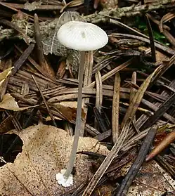 Mycena stylobates, commonly known as the bulbous bonnet, is a species of inedible mushroom in the family Mycenaceae. Found in North America and Europe, it produces small whitish to gray fruit bodies with bell-shaped caps that are up to 15 mm (0.6 in) in diameter. The distinguishing characteristic of the mushroom is the fragile stipe, which is seated on a flat disk marked with distinct grooves, and fringed with a row of bristles. The mushrooms grow in small troops on leaves and other debris of deciduous and coniferous trees. The mushroom's spores are white in deposit, smooth, and ellipsoid-shaped with dimensions of 6–10 by 3.5–4.5 μm. In the development of the fruit body, the preliminary stipe and cap structures appear at the same time within the primordium, and hyphae originating from the stipe form a cover over the developing structures. The mycelia of the mushroom is believed to have bioluminescent properties.