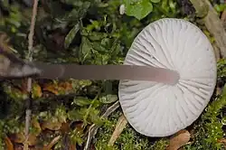 The gills are attached by a tooth and are narrowly adnate, close to subdistant, narrow, equal, white or grayish, and with edges concolorous and often slightly eroded.[12] Berkeley noted that the gills "vary a good deal in colour, and are sometimes very dark".[14] The stem is 6–12 cm (2.4–4.7 in) long, 1.5–2 mm (0.06–0.08 in) thick, equal in width throughout, cartilaginous and tough. The stem color is brown with a tinge of pink, and the color lightens towards the top.[13] It is usually straight but often curved toward the base, and roots into in the debris, or is attached to sticks.[12] Smith has noted that in optimal weather conditions, "robust" forms may be found that are "strict and rigid in their appearance."[15] The buried portion of the stem is covered with thick, stiff whitish hairs, and is surrounded with a thin subgelatinous layer, which causes it to be slimy to the touch. Its color is initially bluish-black, soon gray, nearly the same color as the cap, with the apex somewhat fibrous-striate.[12] The mushroom is inedible.[13]