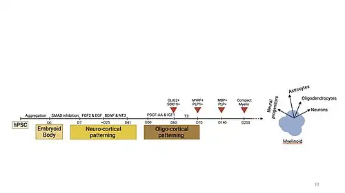 In vivo, neuronal induction precedes oligodendrocyte formation.[25] Therefore, in culture, neuronal induction factors are added first to induce neuro-cortical patterning of the spheroids, followed by factors that induce oligodendrocyte precursor cell (OPC) formation and differentiation into oligodendroglia.[2][23] To promote formation of neurons from neural precursor cells, brain-derived neurotrophic factor (BDNF) and neurotrophic factor 3 (NT3) can be added to the media.[2][23] Subsequently, factors such as platelet-derived growth factor AA (PDGF-AA) and insulin-like growth factor 1 (IGF-1) are added to the media to result in an expansion of the OPC populations present within the organoid by promoting OPC proliferation and survival.[1][2]