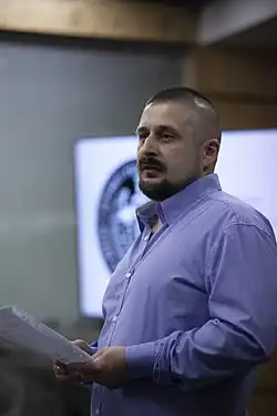 Mykola Serhiyovych Kravchenko (Ukrainian: Микола Сергійович Кравченко; 20 May 1983 – 14 March 2022) was a Ukrainian public and political figure, historian, chief ideologue of the far-right Azov Battalion[1][2] and one of the founders of the Ukrainian ultranationalist organization Patriot of Ukraine. He also served as the deputy leader of the far-right National Corps party. [3] As a historian he researched the history of modern Ukrainian nationalist movement from the late 1980s - present.