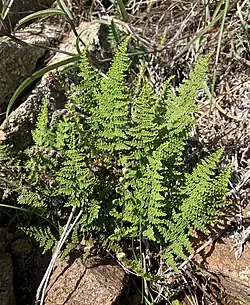 Each leaf typically has from ten to fourteen pairs of pinnae,[2] with the lowest pair comparable in size and shape to the next above.[3] The costa (botany)e (pinna axes) are dark at the base but mostly green on the upper surface.[3] On the underside, they are covered in overlapping scales which often conceal leaf segments from below. The scales are lanceolate to deltate-lanceolate in shape, with bases truncate to subcordate (slightly notched), and no overlapping basal lobes.[2][3] The larger ones are 0.4 to 1.2 millimeters (0.016 to 0.047 in) wide.[3]} The scale margins are entire (untoothed) to denticulate (small-toothed) and they do not bear cilia.[2][3] The ultimate segments of the leaf are bead-like, measuring 1.5 to 3 millimeters (0.06 to 0.1 in) in diameter.[2][3] They may bear a few scales on the underside of the base but are otherwise free of scales and hairs.[2][4]