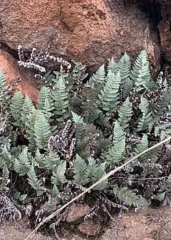 Myriopteris lindheimeri is an apogamous (asexually reproducing) triploid of unknown parentage. Based on plastid DNA sequence, Myriopteris lindheimeri is part of Myriopteris clade C (covillei clade) and is very closely related to Myriopteris yavapensis.[17] It is occasionally misidentified as Myriopteris wootonii.[4][5]