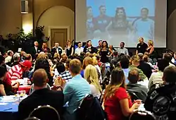 A mystery dinner is a popular type of dinner theater in which the play is a murder mystery, and the diners are invited to solve the mystery as they eat and watch the play. In many mystery dinners, there is no separate stage from the eating area; instead, the actors are mixed in with the diners — and often improvise dialog with diners — creating a more immersive atmosphere.[1][2]