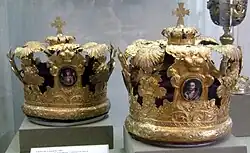 The Mystery of Crowning is a ritual component of the sacrament of marriage in Eastern Christianity. Variations of the crowning ceremony exist in multiple liturgical rites, including the Byzantine, Coptic, West Syriac, and East Syriac Rites of the Eastern Orthodox, Oriental Orthodox, and Eastern Catholic Churches. The crowning ceremony typically features a crown being placed upon the head of both the bride and bridegroom, crowning them as the queen and king of a new family.[1]