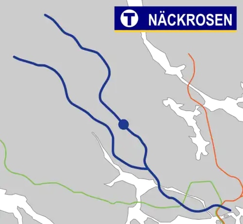 Näckrosen (meaning the water lily) is a station on the Stockholm metro, blue line. The station is located in Solna Municipality (northwestern end of Råsunda area), but one of the entrances is in Sundbyberg Municipality (Storskogen square). The Näckrosen station was opened on 31 August 1975 as part the first stretch of the Blue Line between T-Centralen and Hjulsta. The trains were running via Hallonbergen and Rinkeby.[2] It is located deep underground under a residential area, close to the Gamla Filmstaden former movie production area.