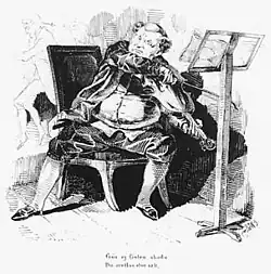 Jean Fredman (1712 or 1713–1767) was a real watchmaker of Bellman's Stockholm. The fictional Fredman, alive after 1767, but without employment, is the supposed narrator in Bellman's epistles and songs.[5] The epistles, written and performed in different styles, from drinking songs and laments to pastorales, paint a complex picture of the life of the city during the 18th century. A frequent theme is the demimonde, with Fredman's cheerfully drunk Order of Bacchus,[6] a loose company of ragged men who favour strong drink and prostitutes. At the same time as depicting this realist side of life, Bellman creates a rococo picture, full of classical allusion, following the French post-Baroque poets. The women, including the beautiful Ulla Winblad, are "nymphs", while Neptune's festive troop of followers and sea-creatures sport in Stockholm's waters.[7] The juxtaposition of elegant and low life is humorous, sometimes burlesque, but always graceful and sympathetic.[2][8] The songs are "most ingeniously" set to their music, which is nearly always borrowed and skilfully adapted.[9]