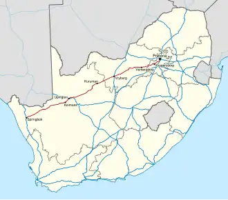 The N14 is a national route in South Africa which runs from Springbok in the Northern Cape to Pretoria in Gauteng. It passes through Upington, Kuruman, Vryburg, Krugersdorp and Centurion.[1] The section between Pretoria and Krugersdorp is maintained by the Gauteng Department of Roads and Transport and is also designated the P158.