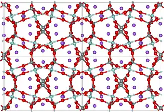 The crystal structure of NASICON compounds was characterized in 1968. It is a covalent network consisting of ZrO6 octahedra and PO4/SiO4 tetrahedra that share common corners. Sodium ions are located at two types of interstitial positions. They move among those sites through bottlenecks, whose size, and thus the NASICON electrical conductivity, depends on the NASICON composition, on the site occupancy,[3] and on the oxygen content in the surrounding atmosphere. The conductivity decreases for x < 2 or when all Si is substituted for P in the crystal lattice (and vice versa); it can be increased by adding a rare-earth compound to NASICON, such as yttria.[1]