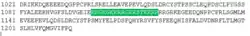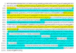 Amino acid sequence of NBPF1 that shows the locations DUF1220 domains(blue) and coiled coil domains(yellow).