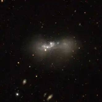 Until 2014, not much was known about the galaxy, other than the fact it was irregular. In early 2014, the galaxy was observed with a 2-foot telescope at the SARA remote observatory in Chile, revealing the galaxy in higher resolution. It appears the galaxy is in the process of forming stars at a high rate - primarily in the red areas in the image. Additionally, the galaxy has several small clumps of stars, implying an ongoing merger.[3]