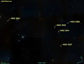 The NGC 2841 group is a group of galaxies about 19.6 million light-years away from Earth. It includes the loose triplet NGC 2541, NGC 2500, and NGC 2552.[1] NGC 2841 is the fourth-brightest galaxy in Ursa Major with an apparent magnitude of 9.2. It is 20' southeast of 3 Lyncis and just below the halfway point of an imaginary line between Theta and 15 Ursae Majoris.[2]