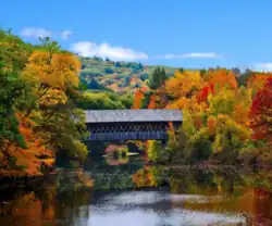 Built in 1829 over the Pemigewasset River. Damaged by a tropical storm in 2011; repaired and reopened in 2015. |