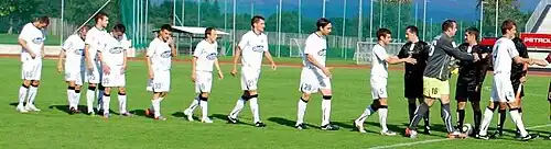 Assisted by semi-retired club legends of the old Olimpija and other notable Slovenian players, the club started to compete in the lowest tier of Slovenian football and won the fifth division in their first year. In the next two seasons, Bežigrad was promoted to the Slovenian Second League, by winning both fourth and third divisions in consecutive seasons.[16] During their season in the fourth division the club changed its name for the first time and became known as Olimpija Bežigrad. This happened despite the claims of Joc Pečečnik, one of the wealthiest man in Slovenia and, at the time, owner of NK Interblock, that he is in fact the sole owner of the Olimpija name and brand.[17] During the 2008–09 season, the club changed their name once again, this time to Olimpija Ljubljana. In the same season, the club won the second division title and earned a promotion to the Slovenian top division. Throughout the path to the top division, Olimpija was supported by Green Dragons, the fan group of the dissolved Olimpija. The success of the club, who earned a promotion from the fifth division to top division in only four seasons, was somewhat dented by a conflict between several players, coaching staff, club leadership and sponsors, which eventually led to a player-led boycott in the final round of the 2008–09 second division season.[18] Due to this event, the club began their first season in Slovenian top flight (2009–10) with a two points deduction.[18] In addition, several notable players, including Miran Pavlin and Amir Karić, left the club.
