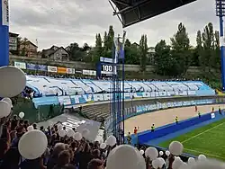 Grbavica was reopened yet again on 25 April 1976, and in 1986 a modern northern stand was added which is still in use. Unfortunately, war began in spring 1992 and Željezničar was forced, yet again, to play on Koševo Stadium until 1996 when it came back to Grbavica. During the 1990s war, the stadium suffered heavy structural damage. The stadium was located between the first front lines and endured heavy fighting. Bosnian Serbs' forces burned down the wooden grandstand under which all the club facilities were located consequently burning down most of the club's records and trophies in the process as well. It was not until 2 May 1996 that a football match would be played on Grbavica Stadium again. Symbolically, the first match after the war was the Sarajevo derby.[23] The wooden grandstand that burned up during the war was never fully reconstructed and on its place, on the west side of the stadium, a much smaller wooden stand was built under which, yet again, all the club facilities are located. In 2016, the wooden stand was reconstructed and slightly expanded in a way that all the wood elements were replaced with anti-slip metal in order to meet the UEFA Stadium requirements.