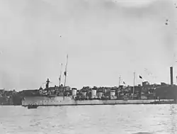 Romania purchased Nibbio and Sparviero in 1920. Nibbio became Mărășești and Sparviero was renamed Mărăști when they were commissioned upon arriving in Romania on 1 July 1920. The ships were formally re-classified as destroyers and assigned to the newly formed Counter-torpedo Division (Diviziunea Contratorpiloarelor) which was renamed as the Destroyer Squadron (Escadrila de Distrugătoare) on 1 April 1927.[10] The sisters were sent to Italy in 1925–1926 for a refit where they had their 152 mm guns replaced by two twin-gun 120 mm Schneider-Canet-Armstrong 1918/19 turrets, one each fore and aft of the superstructure, and a fifth gun on a platform amidships. The aft 76 mm guns removed during this time.[11] Fire-control systems were fitted the following year.[12] The Squadron was visited by King Carol II of Romania and the Prime Minister, Nicolae Iorga, on 27 May 1931.[13] By 1940, the midships 120 mm gun had been replaced by a pair of twin-gun French Hotchkiss 13.2 mm (0.5 in) anti-aircraft machinegun mounts and the remaining 76 mm guns by a pair of German 3.7 cm (1.5 in) SK C/30 AA guns. Depth charge racks had been fitted on the stern and an Italian depth charge thrower was added. The ships could carry 40 depth charges or 50 mines. These changes reduced the displacement of the sisters to 1,410 long tons (1,430 t) at standard load and 1,723 long tons (1,751 t) at deep load.[14]