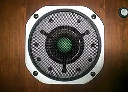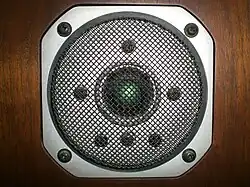 The tweeter is a beryllium deep dome design with a diffuser ring and protective wire net. It operates the frequencies 6 kHz to 20 kHz (and capable of much higher). The dome size is 3 cm (1-3/16") and it weighs only 0.028 grams. Similar to the midrange but smaller, it also has a tangential surround made of cloth coated with resins. The magnet is 18,800 Gauss and 34,000 Maxwell. The frame is diecast aluminum.