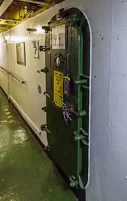 "C" Deck comprises more crew quarters, the laundry and a butcher's shop. A glassed-in central gallery provides a view of the main engine room. A pressure door provides access to the upper levels of the reactor compartment.[10]