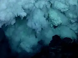 .[6] These bubbles are on average 1–2 centimetres (0.39–0.79 in) wide and quickly rise owing to their buoyancy.[51] Some vents continuously emit carbon dioxide bubbles, others only cyclically.[52] Sulfur is generated by the mixture of sulfur-containing gases with water and forms droplets of liquid sulfur.[44] Sulfur globules form from such droplets; they cover the ground like a powdery dusting[20] and have been recovered from the surfaces of ROVs.[53] Sulfur accumulating in the slopes forms agglomerates and crusts which cement the slopes, reducing their instability.[54]