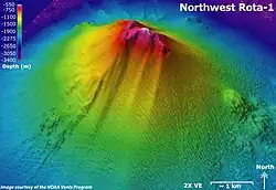 NW Rota-1 is the first volcano where submarine explosive eruptions were directly observed, in 2004.[6][4] The intensity of the eruptions is diminished by being underwater, allowing more direct observations than would be possible at subaerial volcanoes.[7]