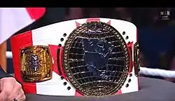 The championship belt was unveiled by WWE executive and NXT head Triple H on April 3, 2018. Featuring three gold plates on a thick brown leather strap, the rounded center plate features a globe that only shows the continent of North America. The banner above the globe reads "North American" and above the banner is the NXT logo. The lower banner at the bottom of the globe reads "Champion". In what has become a prominent feature of WWE's championship belts, the two side plates feature a removable center section which can be customized with the champion's logos; the default side plates feature a vertical NXT logo on a globe. This was WWE's first secondary title to feature customizable side plates. It was the only NXT championship to feature the NXT logo for the default side plates until the introduction of the NXT Women's North American Championship in 2024; the other NXT championships feature the WWE logo.[15]