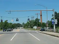 Across the county line in the town of Mendon, NY 15A takes on the name Rush–Lima Road and begins curving to the northwest. It connects to Honeoye Falls twice: first via Main Street at a junction just north of the county line, and later by way of Monroe Street[4] (formerly NY 363[5]) at an intersection 1 mile (1.6 km) to the northwest. Past Monroe Street, the route makes a long, significant turn to the west, following Honeoye Creek into the town of Rush and the hamlet of the same name. The highway meets Rush–West Rush Road at an intersection south of the community, at which point NY 15A turns back to the north and crosses over Honeoye Creek. In the process, NY 15A becomes East Henrietta Road, a name the highway retains until its northern end in Rochester. On the opposite side of the creek, NY 15A intersects NY 251 in the center of Rush.[4]