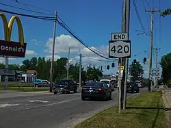 The initial northern terminus of NY 420 was in the center of Massena at the junction of Orvis and Main Streets, where it ended at NY 37.[9] In the mid-1950s, construction began on a new alignment for NY 37 around the southern edge of the village.[10][11] The highway opened to traffic by 1958;[12] however, NY 420 continued to extend past the bypass into Massena until the early 1960s, when it was cut back to its junction with NY 37's new routing.[13] The former routing of NY 420 in Massena is still state-maintained as part of NY 970B, an unsigned reference route designation for all of Main Street between NY 37 and NY 37B.[14]