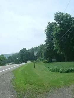 New York State Route 79 (NY 79) is a 93.18-mile-long (149.96 km) east–west state highway in the Southern Tier of New York, in the United States. The western terminus of the route is at the intersection with NY 414 near the southern end of Seneca Lake just northeast of Watkins Glen. Its eastern terminus is at the Pennsylvania state line in the town of Windsor in Broome County, where it connects to Pennsylvania Route 92 (PA 92). NY 79 passes through three regions; it starts in the Finger Lakes region, runs through Central New York and ends on the western fringes of the Catskills. The route is signed east–west, but from Whitney Point to the state line it runs in a north–south orientation and is signed north–south a few miles south of Center Village, a hamlet that is a few miles south of Harpursville.