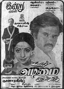 Naan Adimai Illai (transl. I am not a slave) is a 1986 Indian Tamil-language romantic drama film produced and directed by Dwarakish. The film stars Rajinikanth and Sridevi. A remake of the Hindi film Pyar Jhukta Nahin (1985), this was the last Tamil film for Sridevi in 1980s who then concentrated on her Bollywood career, though she would later return to Tamil cinema in the 2010s. Naan Adimai Illai ran for 75 days in all major cities and was a box office failure.[1][2]