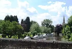 The frontage downstream of the bridge is occupied by a riverside cafe, chandlers and navigation stores, and boat hire facilities. Behind this is an extensive public open space.