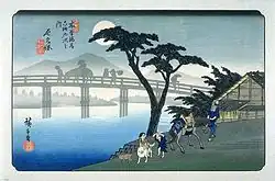 Hiroshige's ukiyo-e print of Nagakubo-shuku dates from 1835 to 1838. The scene depicts the Wada bridge, located just past the post station. In the front of the picture, two children are playing and a traveler is leading his packhorse towards an inn. As was common in the series of prints, the publisher's name appears on the saddlecloth on the horse. The roof of the inn is shown with stones on the tiles to help secure the roof against strong winds - this was a typical method of construction for the region.