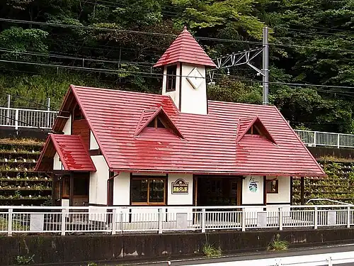 The station has two opposed side platforms serving two tracks, connected to a small red-roofed station building by a level crossing. The station is unattended.