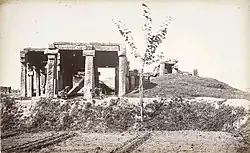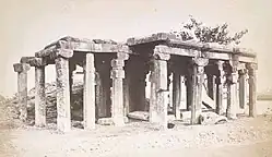 According to Thomas Fraser Peppé, who photographed it in 1870: "The temple behind consists of brick and mud cement, but very little of it is now standing; the superstructure is entirely gone, and none of the temples of this form are sufficiently complete to allow a conjecture as to their original form. The roof of the portico and the shrine is composed of large granite slabs, a linga now occupies the shrine, and there is a mutilated figure of Ganesh lying outside. Judging by the size of the mound, and the part of the shrine remaining, the temple must have been a lofty one...".[1]