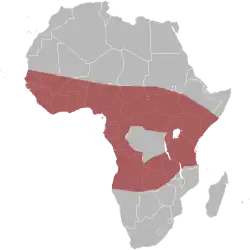 The species is very common and is widespread through much of sub-Saharan Africa and is found in western, eastern, central, and parts of southern Africa. It is absent from the rainforests of the Congo Basin. It has been recorded from Angola, Benin, Burkina Faso, Cameroon, Central African Republic, Chad, Democratic Republic of the Congo (except in the center), Congo, Ethiopia, Gabon, Ghana, Guinea Bissau, Guinea, Ivory Coast, Kenya, Liberia, Mali, Niger, Nigeria, Senegal, Sierra Leone, Gambia, Mauritania, Sudan, Tanzania, Somalia, Togo, Uganda, Zambia.[10] Older records from South Africa, Botswana, Zimbabwe, Eswatini, Mozambique, or most of Namibia refer to Naja mossambica or Naja nigricincta, which were formerly regarded as subspecies of N. nigricollis.