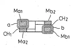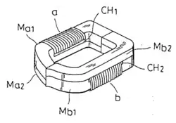 A practical, production-ready design of the Rijckaert – de Niet head for cassette recorders was patented by Niro Nakamichi in November 1981.[f] Fitting two replay sub-channels into 0,6 mm of a cassette track was a challenging task; according to the patent, each of two cores had to be made up of 0.2 mm (0.0079 in) and 0.4 mm (0.016 in) thick lamination stacks; the windings had to be hidden in narrow grooves cut into the sides of the thickest stacks. The patented servo system, which was soon commercialized as the Nakamichi Auto Azimuth Correction (NAAC), analyzed only treble signals in the 2–8 kHz range; the deadband of the control loop was set with a simple diode limiter. The servomechanism was driven by an electric motor and used a complex gear train terminating in a wedge that pushed the pivoting replay head.[24]