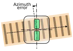 In magnetic recording, "azimuth" denotes the orientation of the magnetic head gap – a narrow, vertical slit that spans the height of the track – with respect to the direction of tape travel.[3] "Absolute azimuth", the angle between the gap and the direction of tape travel, must be set at precisely ninety degrees for correct replay of treble signals. In practice, the main goal is perfecting the "relative azimuth" – the angle between the recording and replay magnetic gaps, which must be as low as possible.[3] A two-head deck, in theory, has zero relative azimuth at a given point in time but in the long term its absolute azimuth drifts away from ninety degrees.[3] The advantage disappears when a two-head deck replays tapes recorded on equipment with an unknown absolute azimuth error.[3]