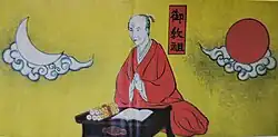 On 26 October 1837 (12 December in the Gregorian calendar), Nakayama Miki's eldest son, Shūji, felt an acute pain in his leg while sowing barley in the fields. A village doctor named Gensuke was summoned to treat the leg.[28] When Shūji's condition did not improve, the family called for Nakatano Ichibei (中野市兵衛), a shugenja (ascetic monk) who was renowned in the area for his healing rituals. Ichibei offered prayers on three occasions, but after each time Shūji had only temporary relief before the pain returned. After Zenbei, Miki's husband, made another entreaty to Ichibei, he agreed to conduct an incantation (yosekaji), a ritual intended to invoke the Buddha's compassion.[29] Over the course of a year, the incantation was conducted nine times.[e]